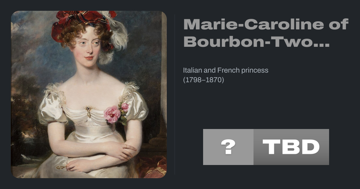 Princess Marie-Caroline of the Two Sicilies (Maria Carolina Ferdinanda Luise; 5 November 1798 โ 16 April 1870) was an Italian princess of the House of Bourbon who married into the French royal family, and was the mother of Henri, Count of Chambord. She led an unsuccessful rebellion against King Louis Philippe I to install her son on the French...