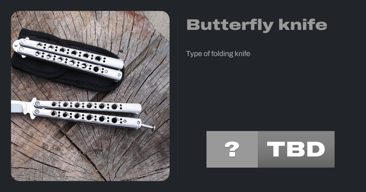 A balisong, also known as a butterfly knife, fan knife or Batangas knife, is a type of folding pocketknife that originated from the Philippines. Its distinct features are two handles counter-rotating around the tang such that, when closed, the blade is concealed within grooves in the handles. A latch sometimes holds the handles together,...