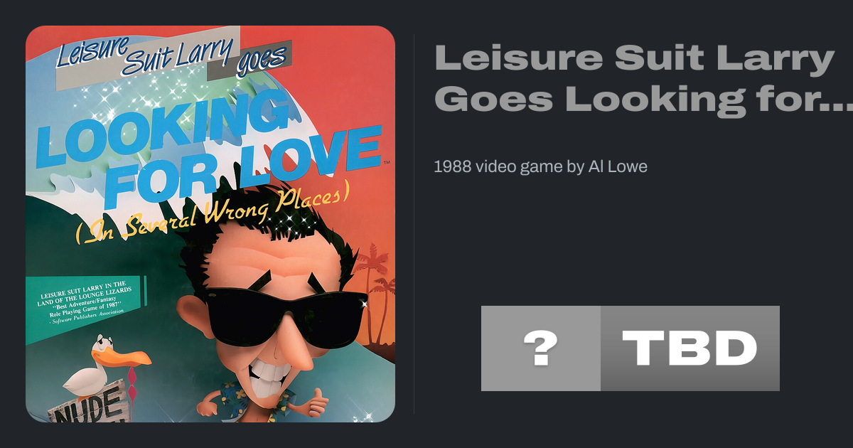 Leisure Suit Larry Goes Looking for Love (in Several Wrong Places) is the second game in the Leisure Suit Larry series of graphical adventure games, designed by Al Lowe and published by Sierra On-Line in 1988. Like its predecessor, Leisure Suit Larry in the Land of the Lounge Lizards, it was developed for multiple platforms, including MS-DOS,...