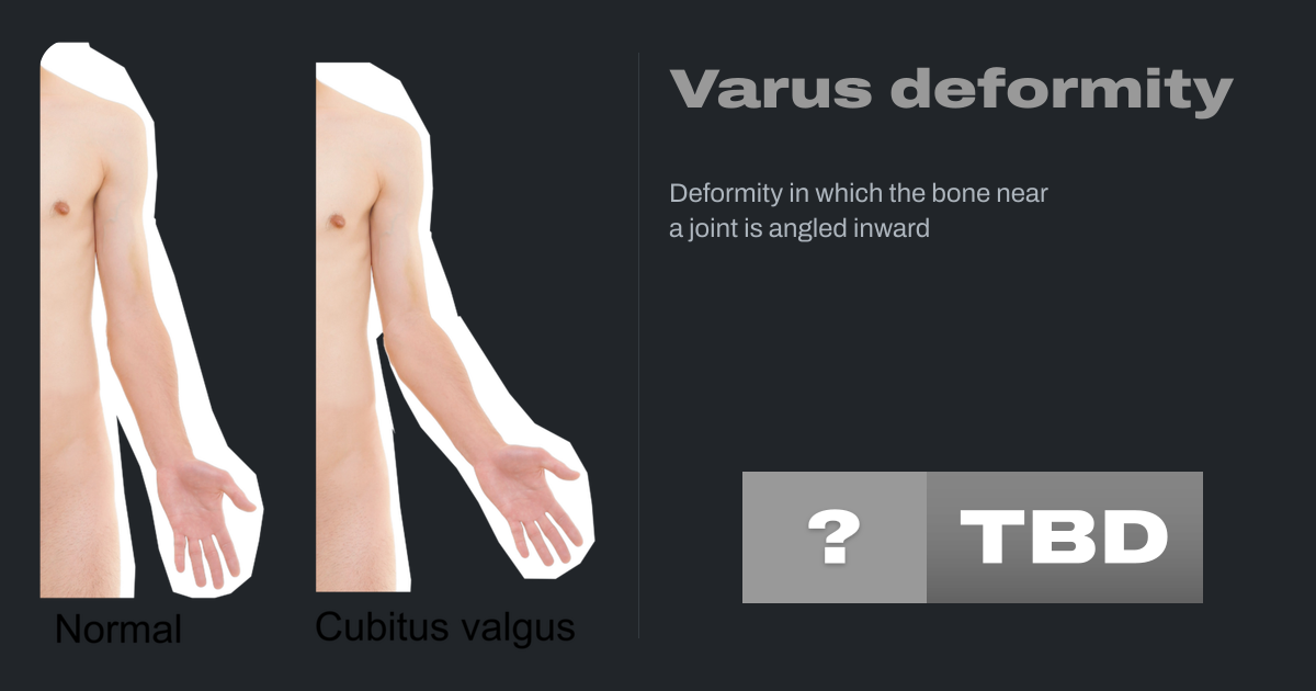 A varus deformity is an excessive inward angulation (medial angulation, that is, towards the body's midline) of the distal segment of a bone or joint. The opposite of varus is called valgus.