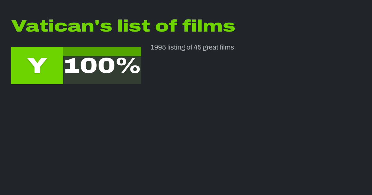 In 1995, on the "centenary of cinematography", 100 years after the Lumière brothers displayed their first film for an audience, the Vatican's Pontifical Council for Social Communications compiled a list called Some Important Films (Italian: Alcuni film importanti). The 45 movies are divided equally into three categories—religion, values, and...
