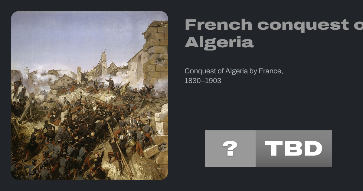 The French conquest of Algeria (French: Conquête de l'Algérie par la France; Arabic: الغزو الفرنسي للجزائر) took place between 1830 and 1847. In 1827, an argument between Hussein Dey, the ruler of the Regency of Algiers, and the French consul escalated into a naval blockade, following which the Kingdom of France invaded Algiers in 1830, and...