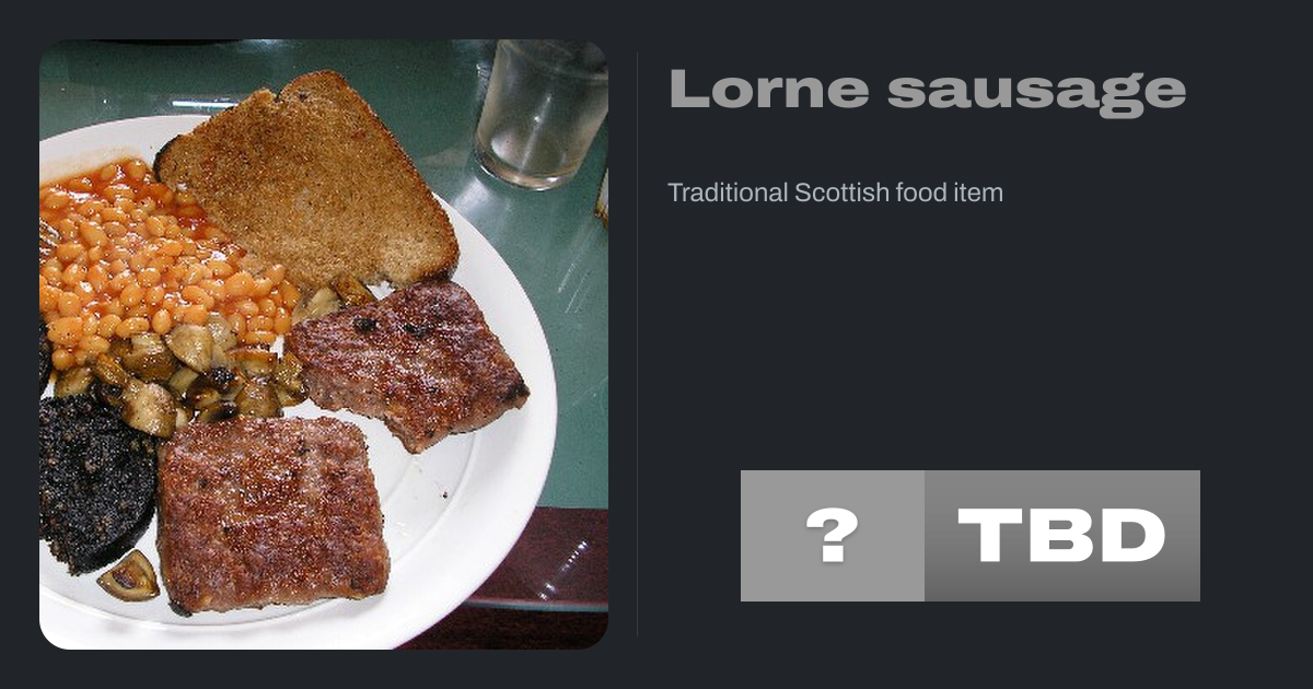The Lorne sausage, also known as square sausage or slice sausage, is a traditional Scottish food item made from minced meat, rusk and spices. Although termed a sausage, no casing is used to hold the meat in shape, hence it is usually served as square slices from a formed block. It is a common component of the traditional Scottish breakfast.