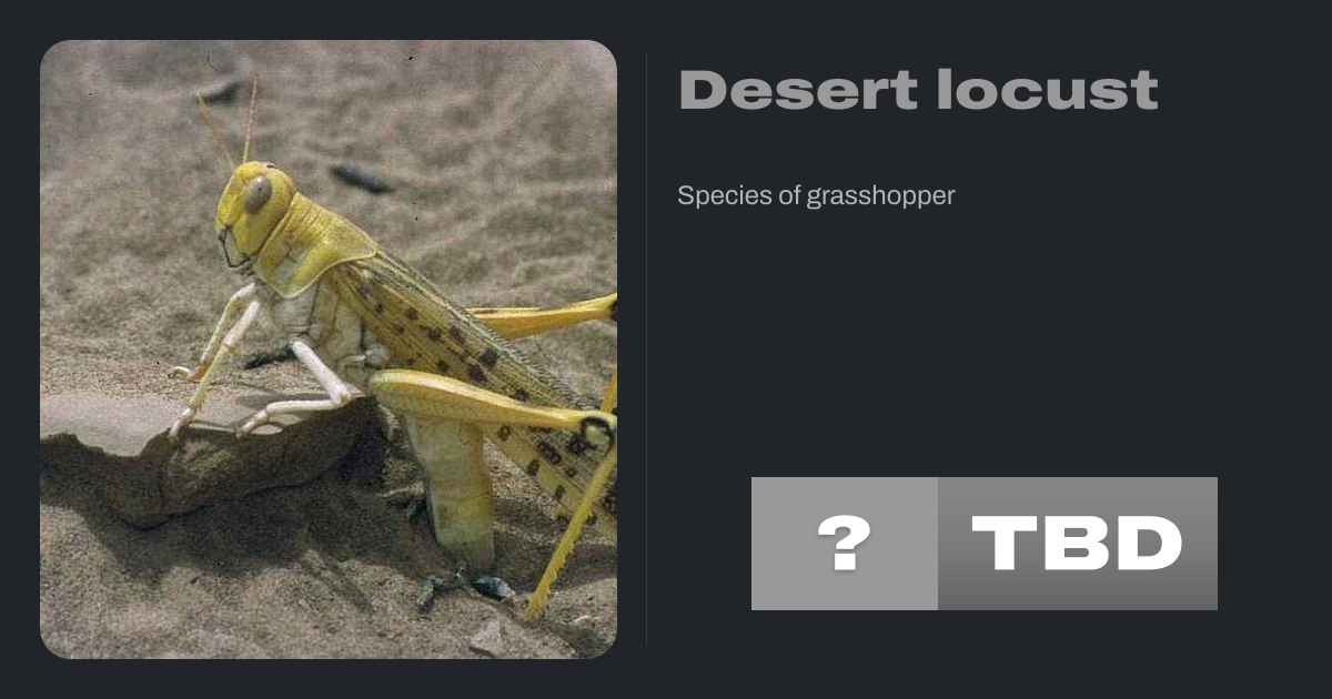 The desert locust (Schistocerca gregaria) is a species of locust, a periodically swarming, short-horned grasshopper in the family Acrididae. They are found primarily in the deserts and dry areas of northern and eastern Africa, Arabia, and southwest Asia. During population surge years, they may extend north into parts of Southern Europe, south...