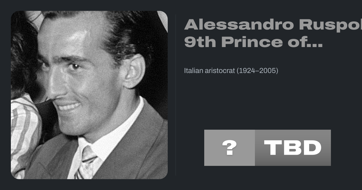 Alessandro "Dado" Ruspoli, 9th Prince of Cerveteri (Italian pronunciation: [alesˈsandro ˈdaːdo ˈruspoli]; 9 December 1924 – 11 January 2005) was an occasional actor and legendary figure of Rome's "dolce vita" era in the 1950s and 60s. Known for his eccentric lifestyle and charismatic personality, he was the 9th Prince of Cerveteri, 9th Marquess...