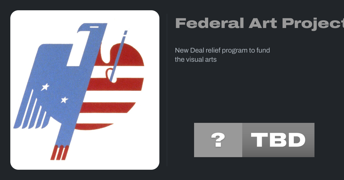 The Federal Art Project (1935–1943) was a New Deal program to fund the visual arts in the United States. Under national director Holger Cahill, it was one of five Federal Project Number One projects sponsored by the Works Progress Administration (WPA), and the largest of the New Deal art projects. It was created not as a cultural activity, but...