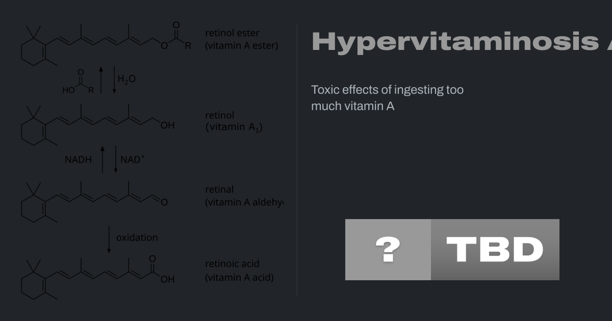 Hypervitaminosis A refers to the toxic effects of ingesting too much preformed vitamin A (retinyl esters, retinol, and retinal). Symptoms arise as a result of altered bone metabolism and altered metabolism of other fat-soluble vitamins. Hypervitaminosis A is believed to have occurred in early humans, and the problem has persisted throughout...