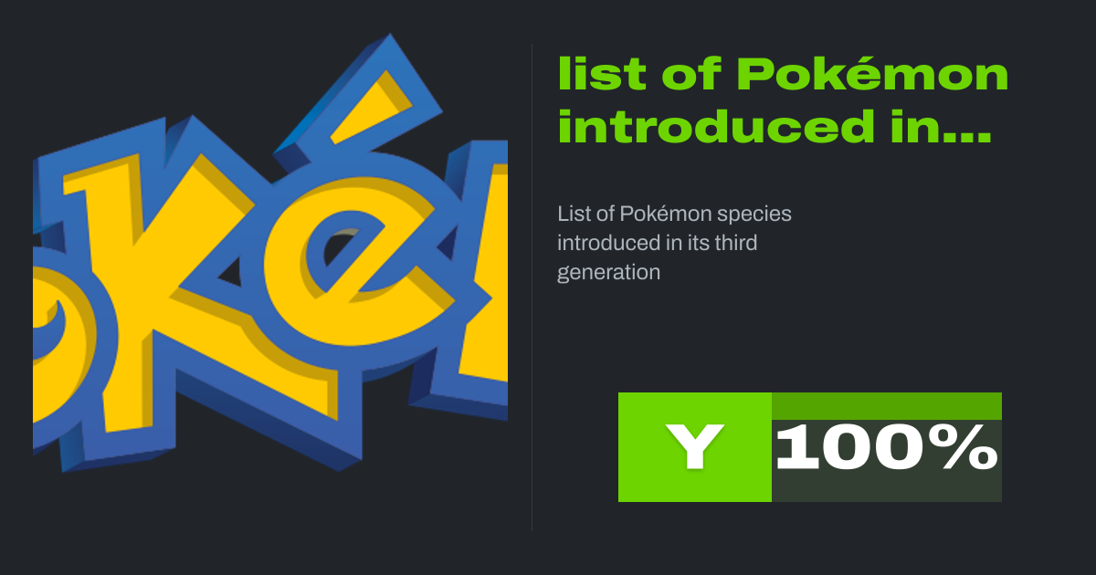 The third generation (generation III) of the Pokémon franchise features 135 fictional species of creatures introduced to the core video game series in the 2002 Game Boy Advance games Pokémon Ruby and Sapphire. These games were accompanied by the television series Pokémon Advanced, which aired from November 21, 2002, until August 28, 2003, in Japan.