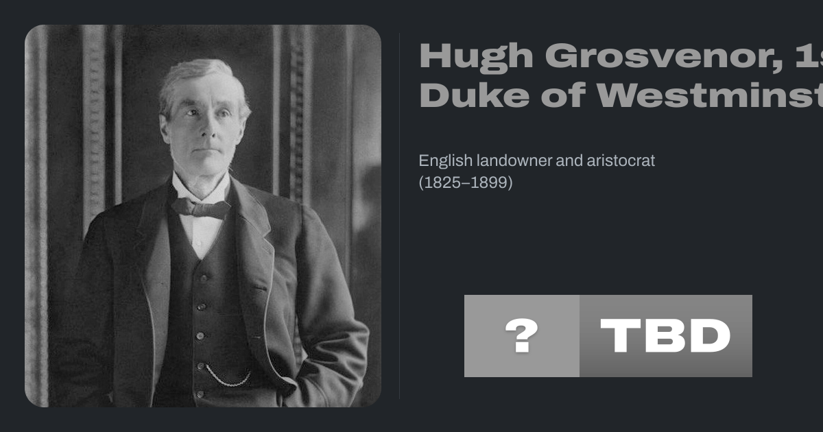 Hugh Lupus Grosvenor, 1st Duke of Westminster, (13 October 1825 β 22 December 1899), styled Viscount Belgrave between 1831 and 1845, Earl Grosvenor between 1845 and 1869, and known as The Marquess of Westminster between 1869 and 1874, was an English landowner, politician and racehorse owner. He inherited the estate of Eaton Hall in Cheshire and...