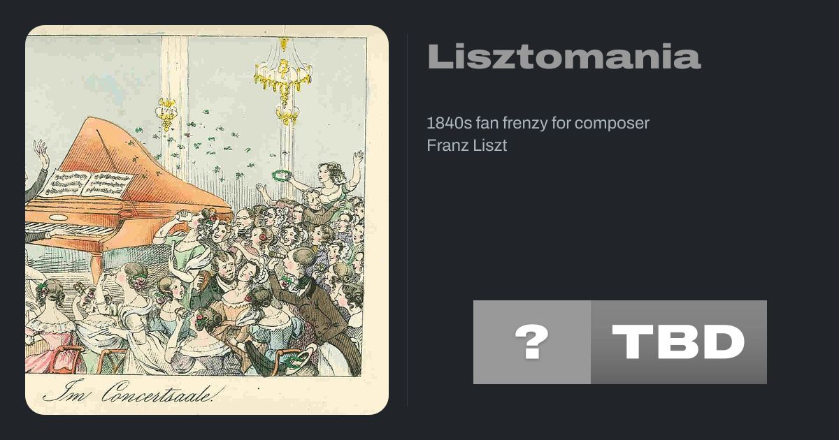 Lisztomania or Liszt fever was the intense fan frenzy directed toward Hungarian composer Franz Liszt during his performances. This frenzy first occurred in Berlin in 1841 and the term was later coined by Heinrich Heine in a feuilleton he wrote on 25 April 1844, discussing the 1844 Parisian concert season. Lisztomania was characterized by intense...