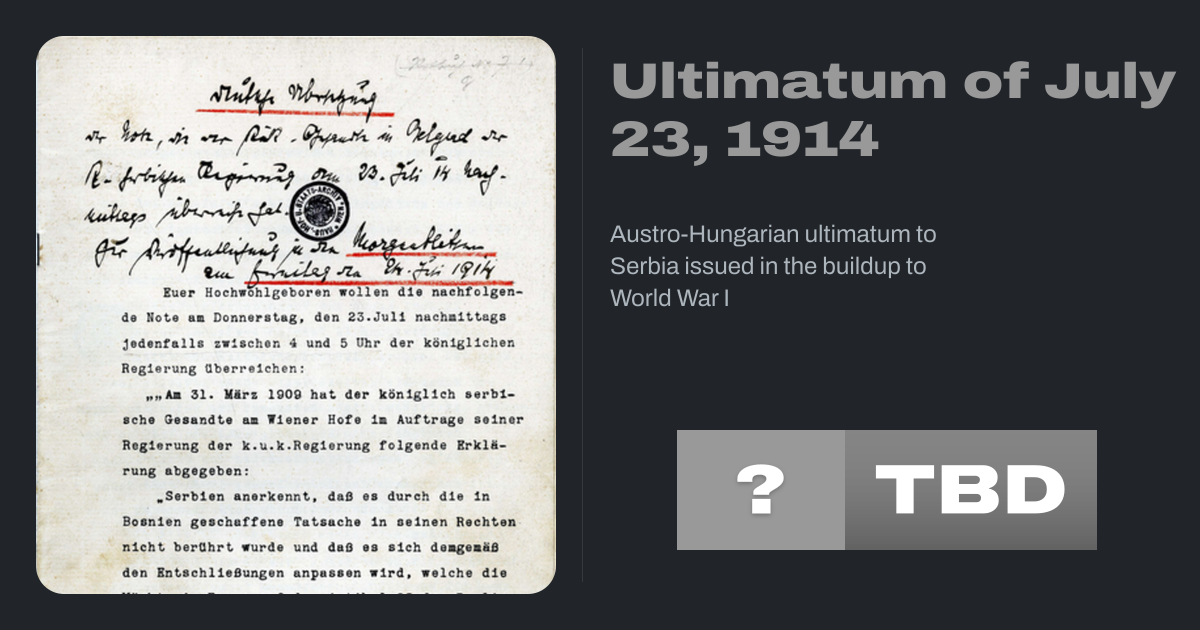 The ultimatum of July 23, 1914, was a diplomatic note delivered by the Austro-Hungarian ambassador in Belgrade to the Serbian Minister of Finance. The issuance of the ultimatum is widely seen as an immediate precursor to the outbreak of World War I in August 1914. The note was Austria-Hungary's response to the assassination of Archduke Franz...