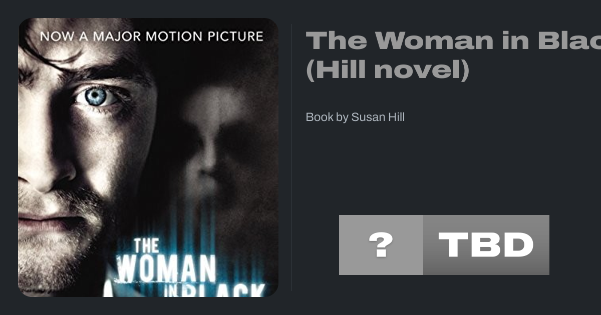 The Woman in Black is a 1983 gothic horror novel by English writer Susan Hill, about a mysterious spectre that haunts a small English town. A television film based on it, also called The Woman in Black, was produced in 1989, with a screenplay by Nigel Kneale. In 2012, another film adaptation was released starring Daniel Radcliffe.