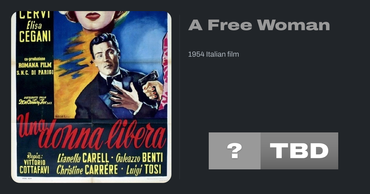 A Free Woman (Italian: Una donna libera) is a 1954 Italian melodrama film directed by Vittorio Cottafavi. The film's sets were designed by the art director Dario Cecchi. In 2008, the film was included on the Italian Ministry of Cultural Heritage’s 100 Italian films to be saved, a list of 100 films that "have changed the collective memory of the...