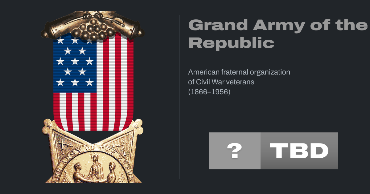 The Grand Army of the Republic (GAR) was a fraternal organization composed of veterans of the Union Army (United States Army), Union Navy (U.S. Navy), and the Marines who served in the American Civil War. It was founded in 1866 in Decatur, Illinois, and grew to include thousands of "posts" (local community units) across the North and West. It...