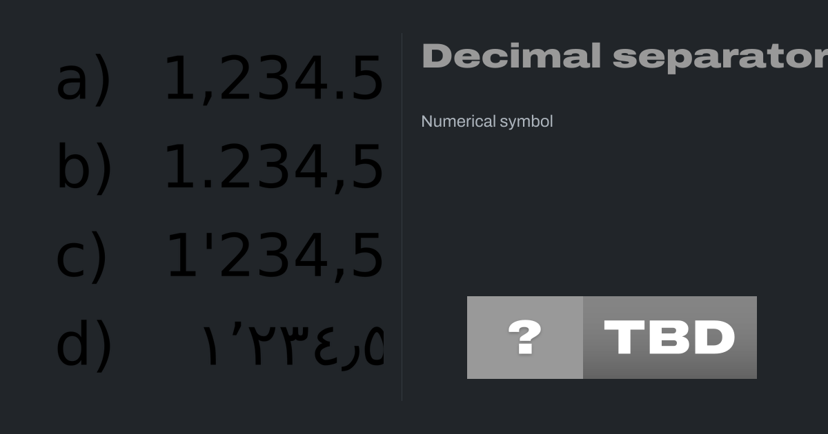 A decimal separator is a symbol that separates the integer part from the fractional part of a number written in decimal form. Different countries officially designate different symbols for use as the separator. The choice of symbol can also affect the choice of symbol for the thousands separator used in digit grouping.