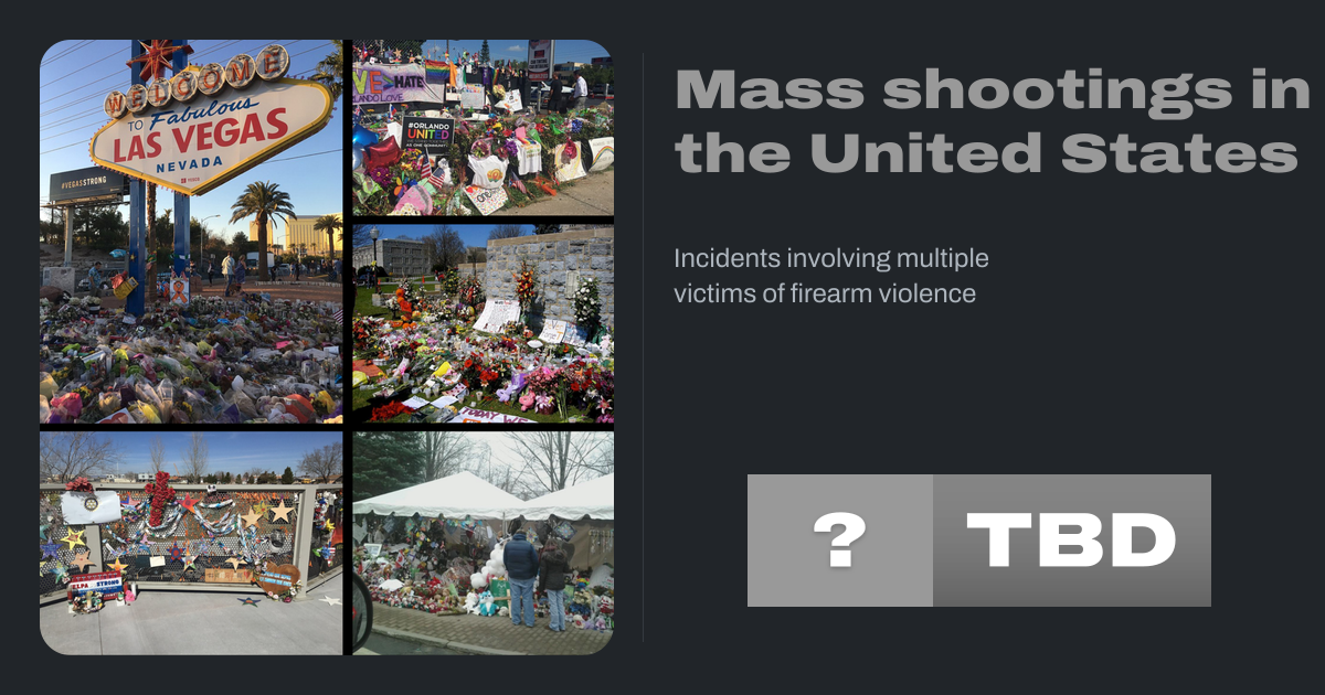 Mass shootings are incidents involving multiple victims of firearm related violence. Definitions vary, with no single, broadly accepted definition. One definition is an act of public firearm violence—excluding gang killings, domestic violence, or terrorist acts sponsored by an organization—in which a shooter kills at least four victims. Using...