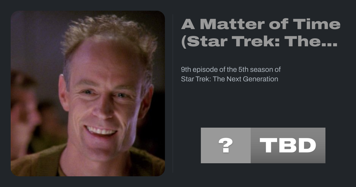 "A Matter of Time" is the 109th episode of the American science fiction television series Star Trek: The Next Generation, and the ninth episode of the fifth season. It aired in syndication on November 18, 1991.