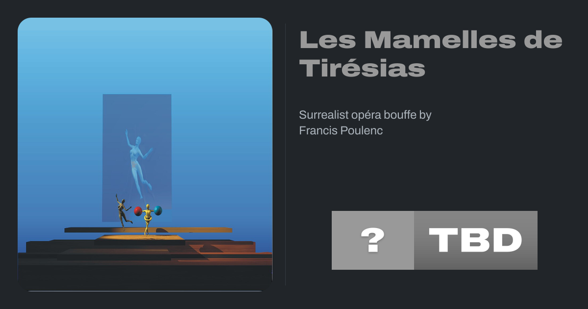 Les Mamelles de Tirésias (The Breasts of Tiresias) is an opéra bouffe by Francis Poulenc, in a prologue and two acts based on the eponymous play by Guillaume Apollinaire. The opera was written in 1945 and first performed in 1947. Apollinaire's play, written in 1903, was revised with a sombre prologue by the time it premiered during World War I...