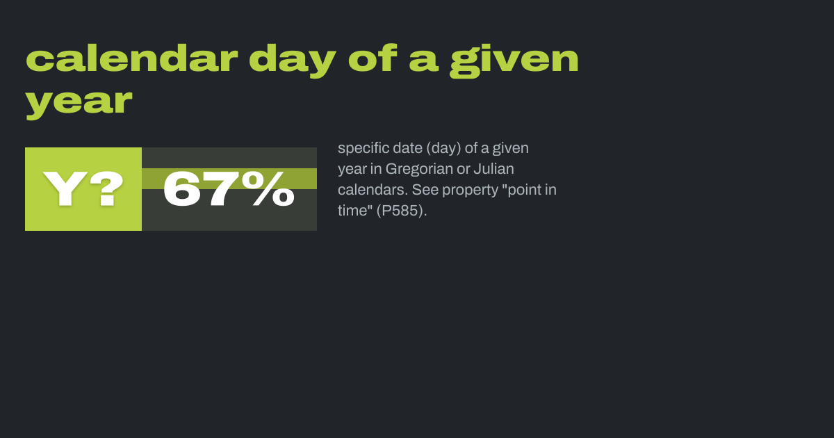 specific date (day) of a given year in Gregorian or Julian calendars. See property "point in time" (P585).