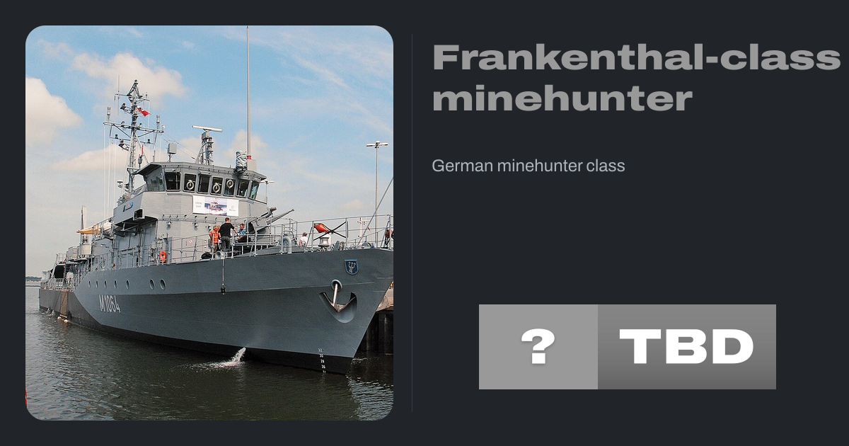 The Type 332 Frankenthal-class minehunter is a class of minehunters of the German Navy. The ships are built of non-magnetic steel. The hull, machinery and superstructure of this class is similar to the original Type 343 Hameln-class minesweeper, but the equipment differs. The class forms the 3 Minesweeper Squadron of the German Navy. These...