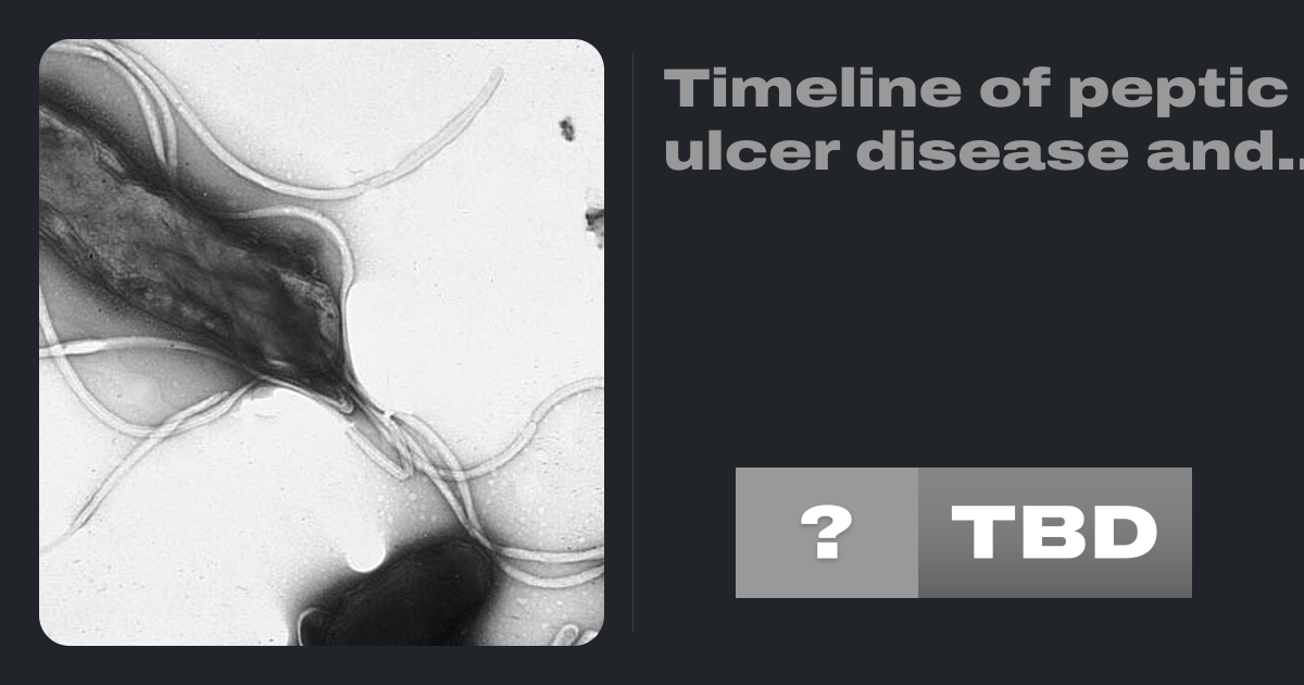 This is a timeline of the events relating to the discovery that peptic ulcer disease and some cancers are caused by H. pylori. In 2005, Barry Marshall and Robin Warren were awarded the Nobel Prize in Physiology or Medicine for their discovery that peptic ulcer disease (PUD) was primarily caused by Helicobacter pylori, a bacterium with affinity...