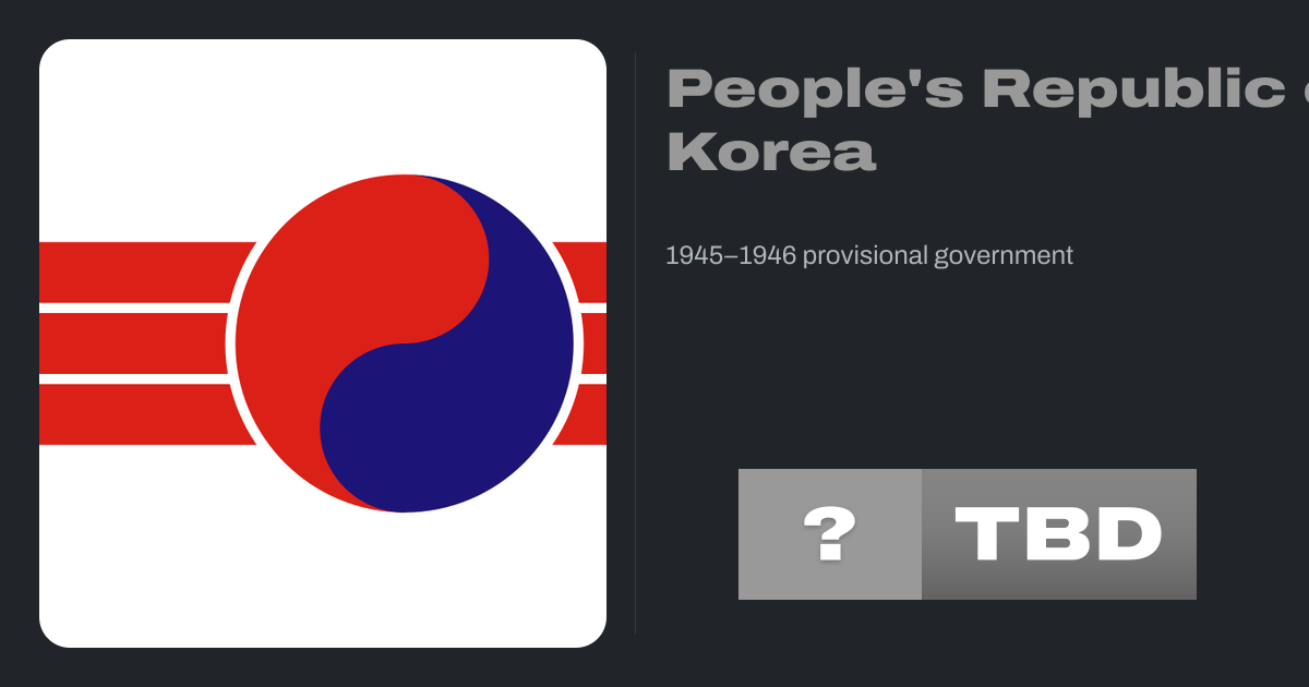 The People's Republic of Korea (PRK; Korean: 조선인민공화국) was a short-lived provisional government that was organized at the time of the surrender of the Empire of Japan at the end of World War II. It was proclaimed on 6 September 1945, as Korea was being divided into two occupation zones, with the Soviet Union occupying the north and the United...