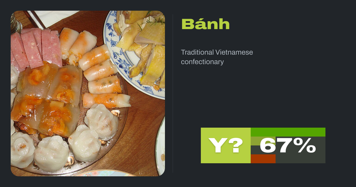 In Vietnamese, the term bánh (Hanoi: [ɓaʲŋ̟˧˥] or Saigon: [ɓan˧˥], Chữ Nôm: 餅) translates loosely as "cake" or "bread", but refers to a wide variety of prepared foods that can easily be eaten by hands or chopsticks. With the addition of qualifying adjectives, bánh refers to a wide variety of sweet or savory, distinct cakes, buns, pastries,...