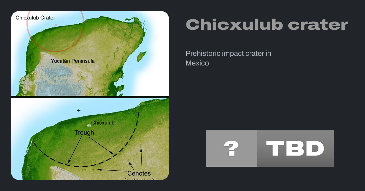 The Chicxulub crater is an impact crater buried underneath the Yucatán Peninsula in Mexico. Its center is offshore, but the crater is named after the onshore community of Chicxulub Pueblo (not to be confused with the larger coastal town of Chicxulub Puerto). It was formed slightly over 66 million years ago when an asteroid, about ten kilometers...