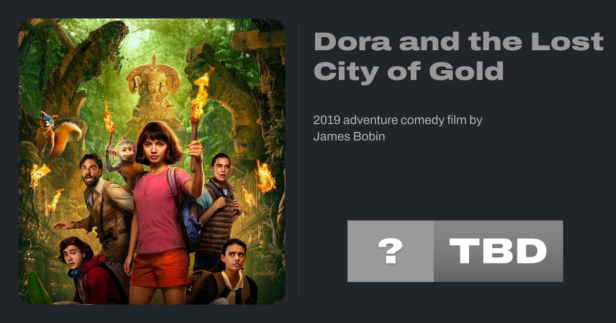Dora and the Lost City of Gold is a 2019 American adventure comedy film loosely based on the Dora the Explorer animated television series, and the first feature film in the franchise. The film was directed by James Bobin and written by Nicholas Stoller and Matthew Robinson, and stars Isabela Moner, Eugenio Derbez, Michael Peña and Eva Longoria,...