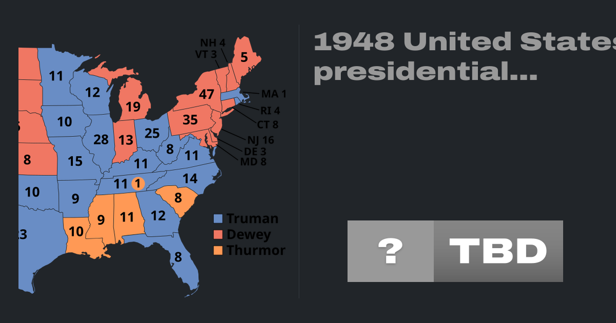 Presidential elections were held in the United States on November 2, 1948. The Democratic ticket of incumbent President Harry S. Truman and Senator Alben Barkley defeated the Republican ticket of New York Governor Thomas E. Dewey and California Governor Earl Warren, and the Dixiecrat ticket of South Carolina Governor Strom Thurmond and...
