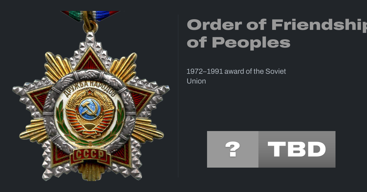 The Order of Friendship of Peoples (Russian: oрден Дружбы народов, romanized: orden Druzhby narodov) was an order of the Soviet Union, and was awarded to persons (including non-citizens), organizations, enterprises, military units, as well as administrative subdivisions of the USSR for accomplishments in strengthening of inter-ethnic and...