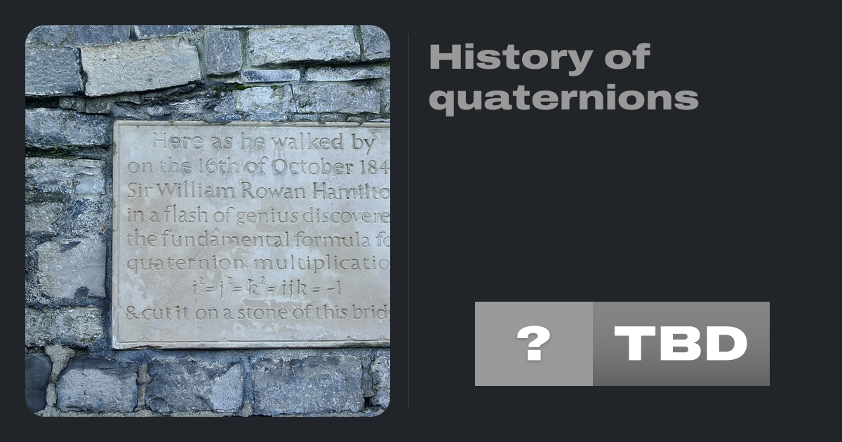 This early morning I reached the goal of my “pilgrimage” to this unassuming bridge in North-West Dublin where none other than Sir William Hamilton carved his solution to represent rotations in 3D space using quaternions. en.wikipedia.org/wiki/History...
