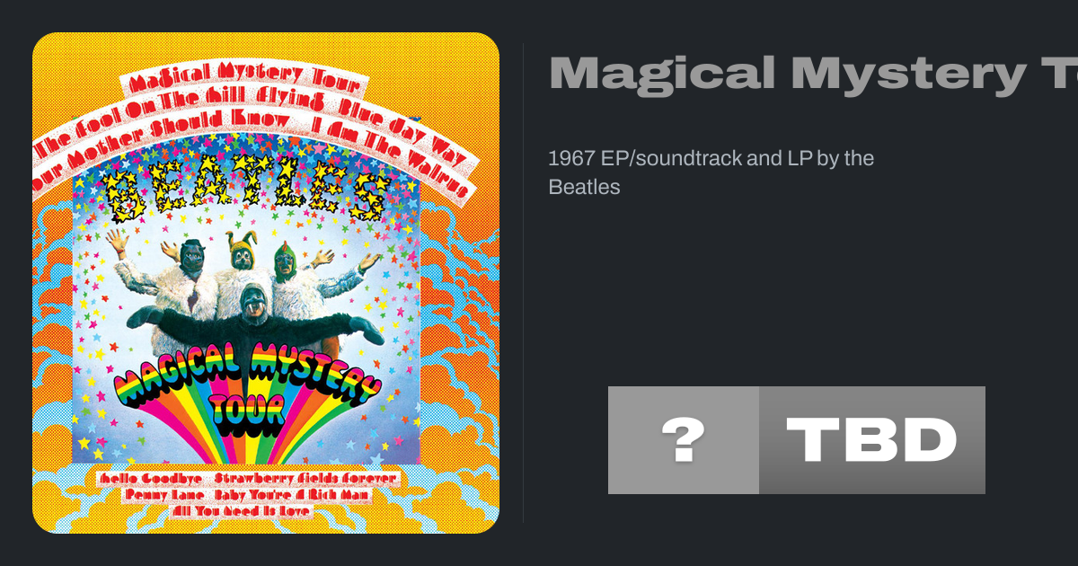 Magical Mystery Tour is a record by the English rock band the Beatles that was released as a double EP in the United Kingdom and an LP in the United States. It includes the soundtrack to the 1967 television film of the same title. The EP was issued in the UK on 8 December 1967 on the Parlophone label, while the Capitol Records LP release in the...