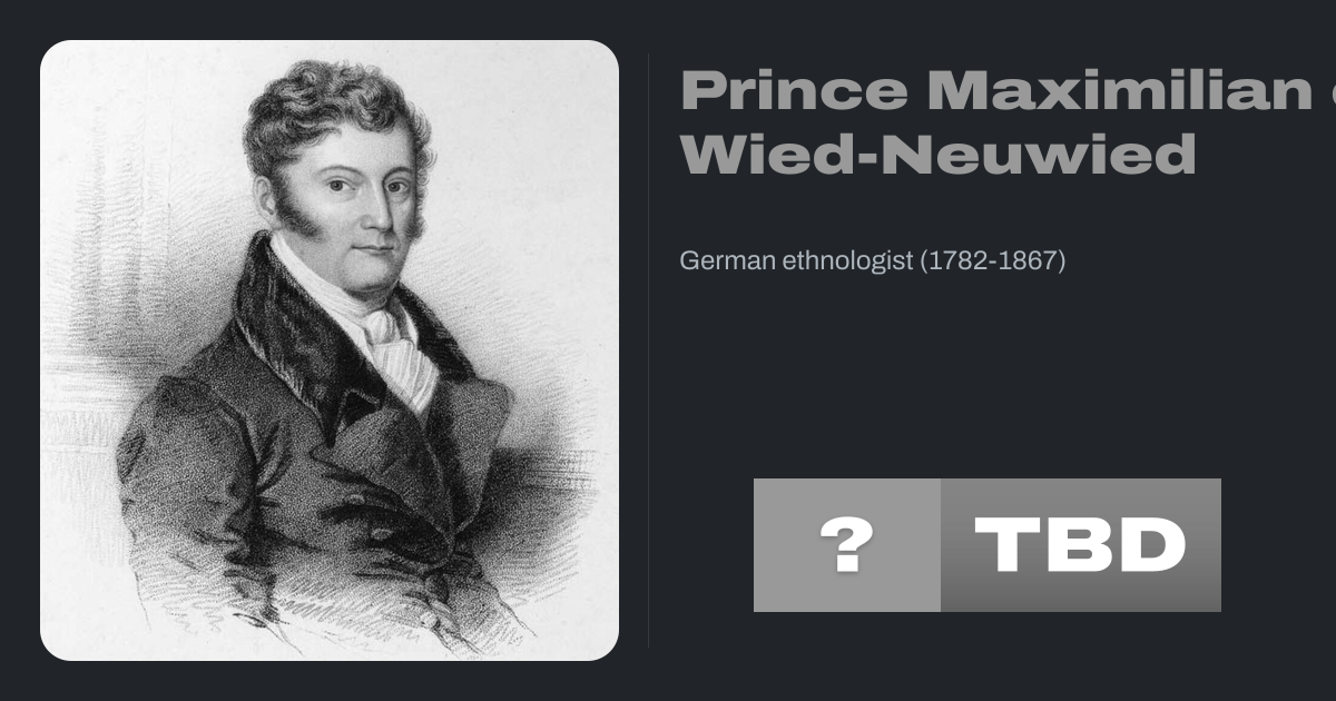 Prince Alexander Philipp Maximilian zu Wied-Neuwied (23 September 1782 – 3 February 1867) was a German explorer, ethnologist and naturalist. He led a pioneering expedition to southeast Brazil between 1815 and 1817, from which the album Reise nach Brasilien, which first revealed to Europe real images of Brazilian Indians, was the ultimate result....