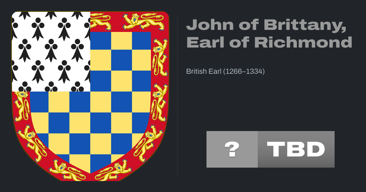 John of Brittany (French: Jean de Bretagne; c. 1266 โ 17 January 1334), 4th Earl of Richmond, was an English nobleman and a member of the Ducal house of Brittany, the House of Dreux. He entered royal service in England under his uncle Edward I, and also served Edward II. On 15 October 1306 he received his father's title of Earl of Richmond. He...