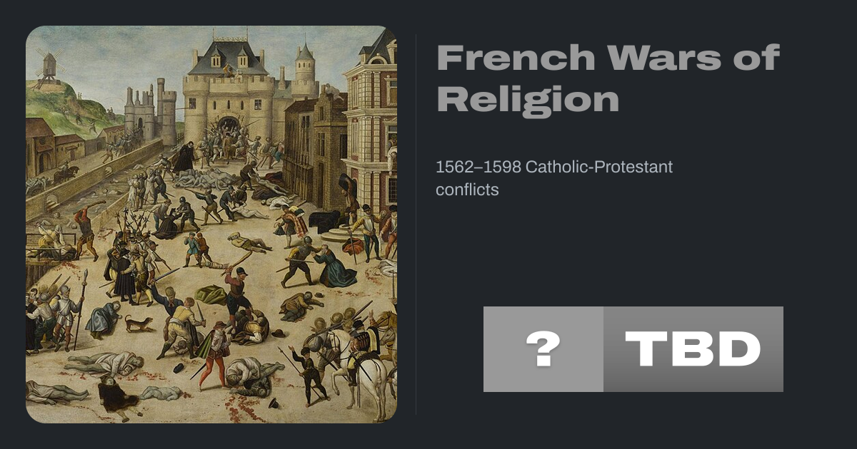 The French Wars of Religion were a series of civil wars between French Catholics and Protestants (called Huguenots) from 1562 to 1598. Between two and four million people died from violence, famine or disease directly caused by the conflict, and it severely damaged the power of the French monarchy. One of its most notorious episodes was the St....