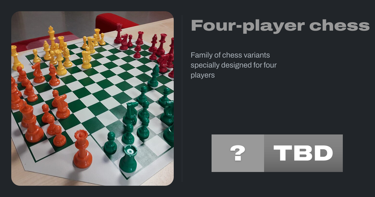 Four-player chess (also known as four-handed chess) is a family of chess variants played with four people. The game features a special board typically made of a standard 8×8 square, with 3 rows of 8 cells each extending from each side, and requires two sets of differently colored pieces. The rules are similar to, but not the same as, regular...