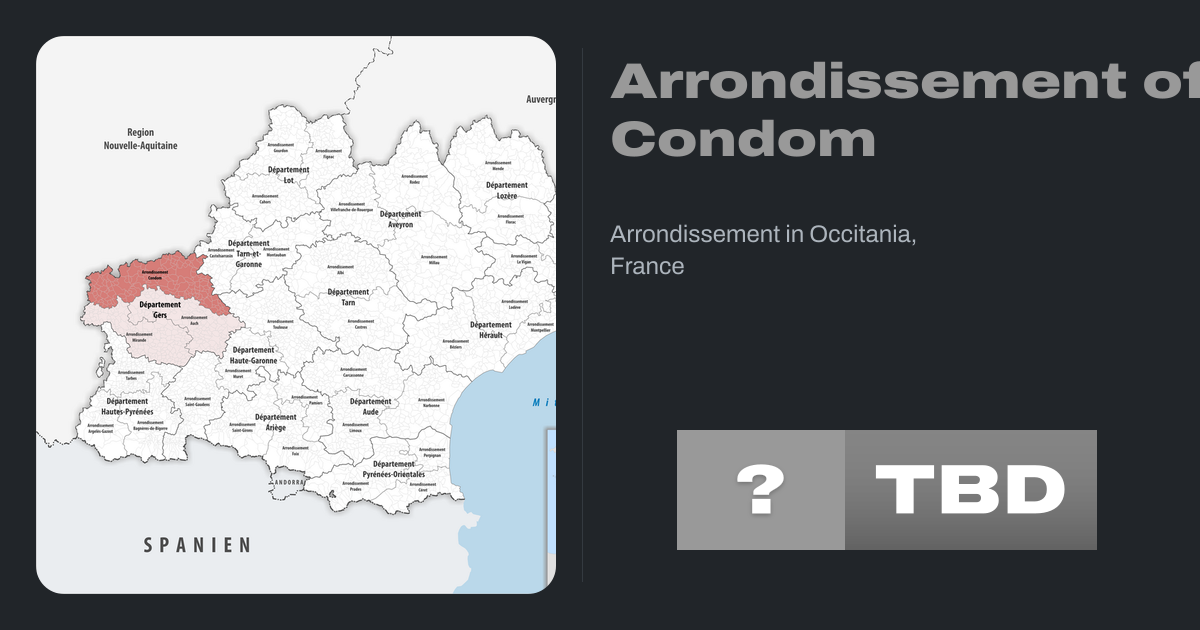 The arrondissement of Condom is an arrondissement of France in the Gers department in the Occitanie region. It has 162 communes. Its population is 67,137 (2016), and its area is 2,462.2 km2 (950.7 sq mi).