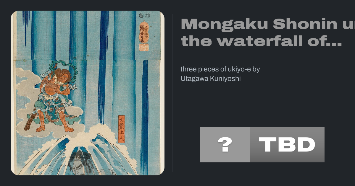 Mongaku Shonin under the waterfall of Nachi, encouraged by Fudo Myoo and his acolytes Kongara and Seitaka