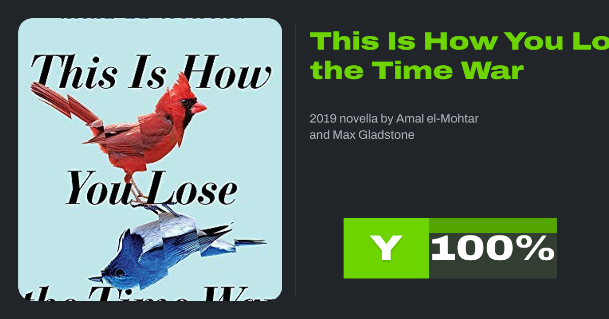 This Is How You Lose the Time War is a 2019 science fiction epistolary novella by Amal El-Mohtar and Max Gladstone. It was first published by Simon & Schuster. It won the BSFA Award for Best Shorter Fiction, the Nebula Award for Best Novella of 2019, and the 2020 Hugo Award for Best Novella.