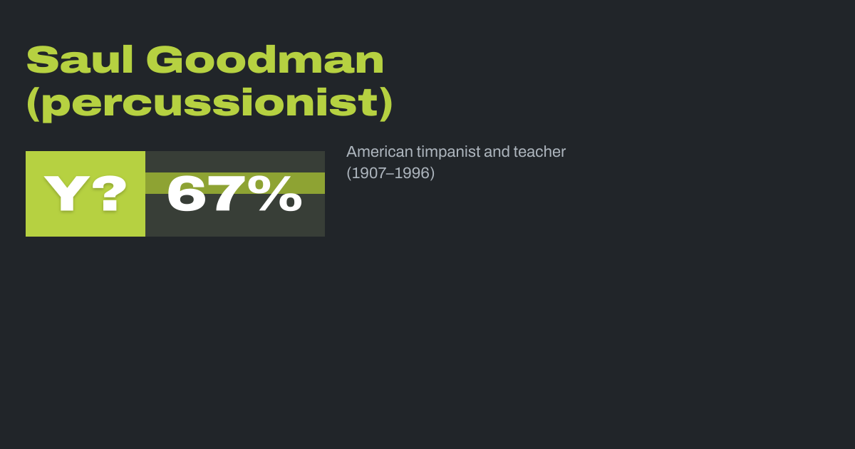 Saul Goodman (July 16, 1907 โ January 26, 1996) was the principal timpanist of the New York Philharmonic from 1926 to 1972.