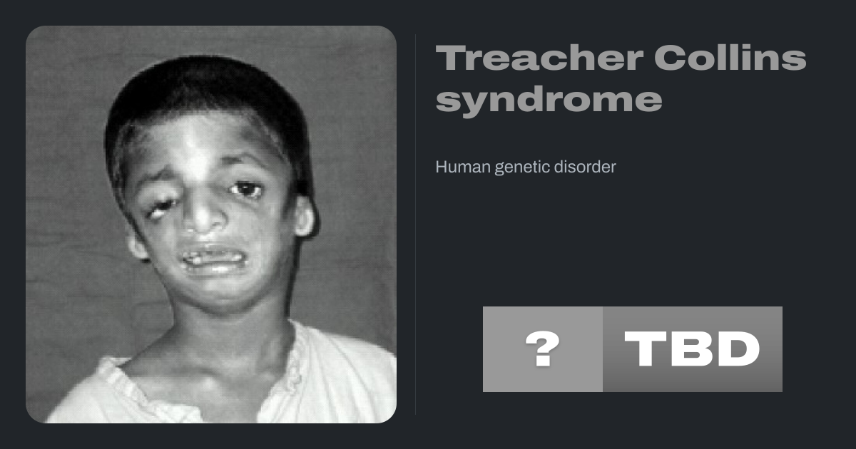 Treacher Collins syndrome (TCS) is a genetic disorder characterized by deformities of the ears, eyes, cheekbones, and chin. The degree to which a person is affected may vary from mild to severe. Complications may include breathing problems, problems seeing, cleft palate, and hearing loss. Those affected generally have normal intelligence.