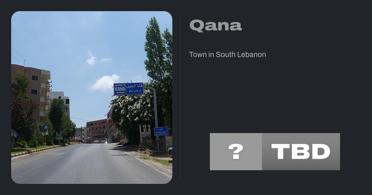 Qana (Arabic: قانا), also spelled Cana, Canna or Kana, is a municipality in southern Lebanon located 10 kilometres (6.2 mi) southeast of the city of Tyre and 12 kilometres (7.5 mi) north of the border with Israel, in an area historically known as Upper Galilee. Qana is known for its antiquity, as well as possibly being the place where Jesus of...