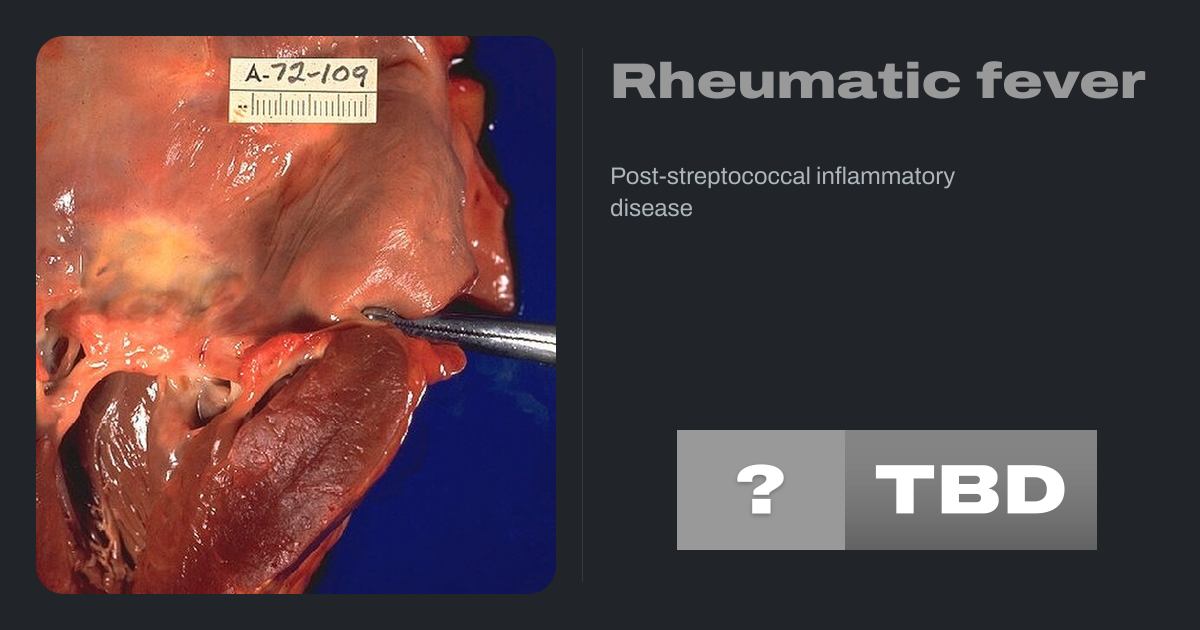 Rheumatic fever (RF) is an inflammatory disease that can involve the heart, joints, skin, and brain. The disease typically develops two to four weeks after a streptococcal throat infection. Signs and symptoms include fever, multiple painful joints, involuntary muscle movements, and occasionally a characteristic non-itchy rash known as erythema...