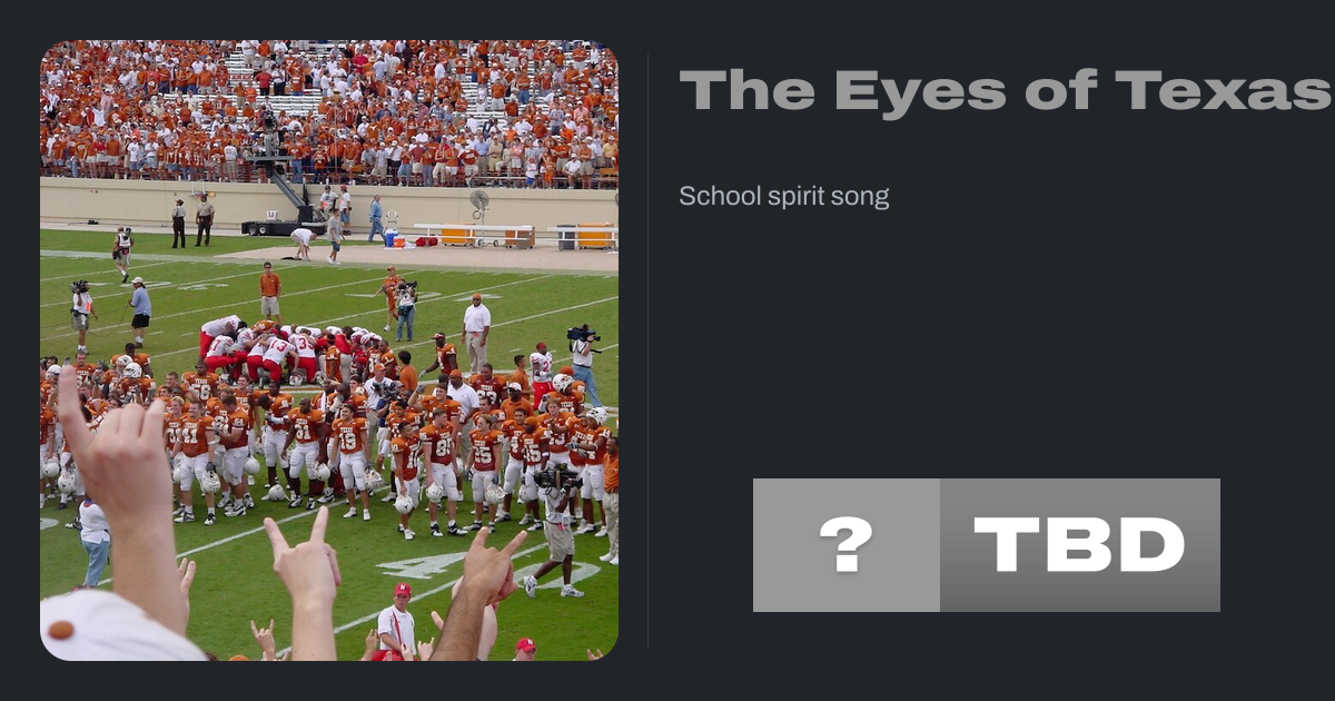 "The Eyes of Texas" is the school spirit song of the University of Texas at Austin. It is set to the tune of "I've Been Working on the Railroad". Students, faculty, staff, and alumni of the university sing the song at Texas Longhorns sports games, before the fireworks and other events.