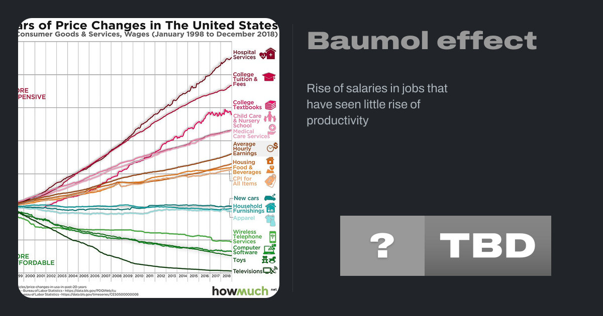 In economics, the Baumol effect, or Baumol's cost disease, first described by William J. Baumol and William G. Bowen in the 1960s, is the tendency for wages in jobs that have experienced little or no increase in labor productivity to rise in response to rising wages in other jobs that did experience high productivity growth. In turn, these...
