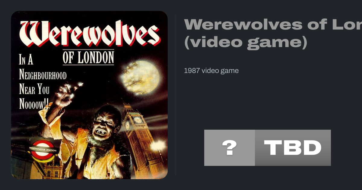 Werewolves of London is a video game released in 1987 for the ZX Spectrum, Commodore 64 and the Amstrad CPC. It was released on a cassette with the Amstrad version on one side and the Spectrum version on the other, this scheme being referred to as "Flippy". The game used the same engine as Viz Design's (consisting of Steve Howard and Paul Smith)...