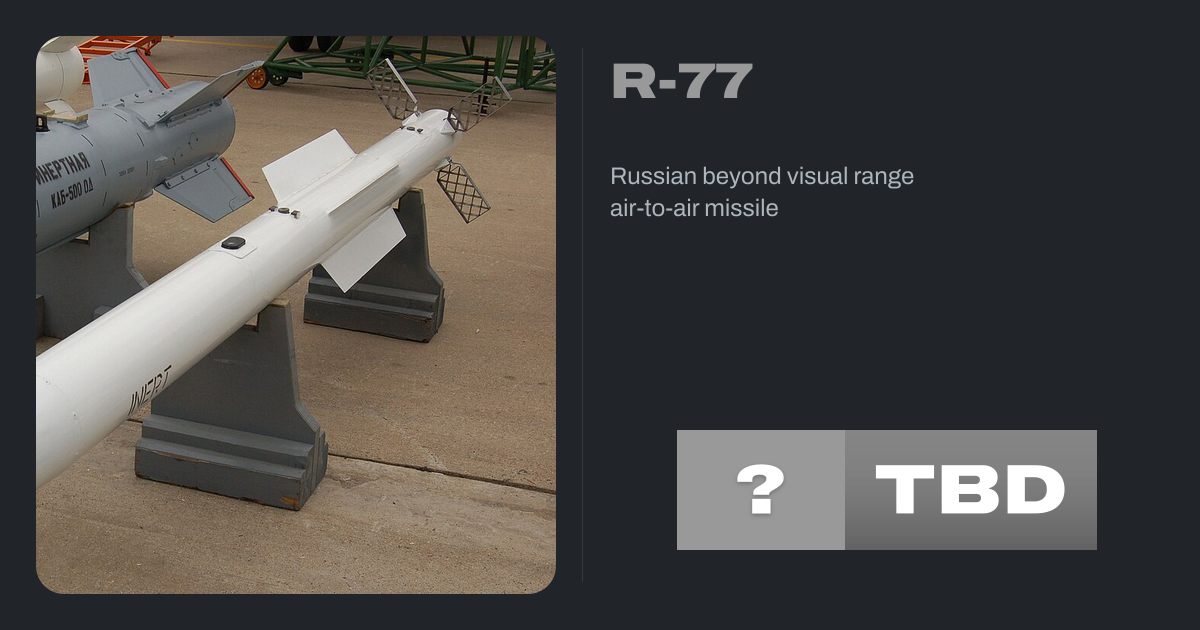 The Vympel NPO R-77 missile (NATO reporting name: AA-12 Adder) is a Russian active radar homing beyond-visual-range air-to-air missile. It is also known by its export designation RVV-AE. It is the Russian counterpart to the American AIM-120 AMRAAM missile.