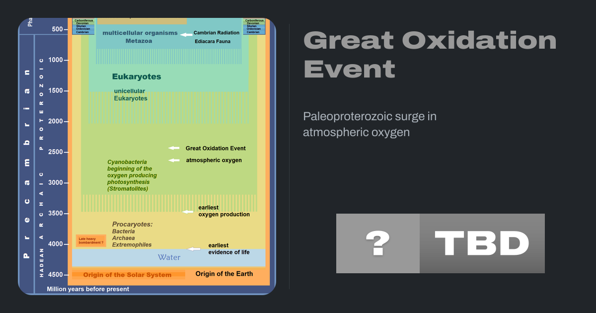 The Great Oxidation Event (GOE) or Great Oxygenation Event, also called the Oxygen Catastrophe, Oxygen Revolution, Oxygen Crisis, or Oxygen Holocaust, was a time interval during the Earth's Paleoproterozoic era when the Earth's atmosphere and shallow seas first experienced a rise in the concentration of free oxygen. This began approximately...