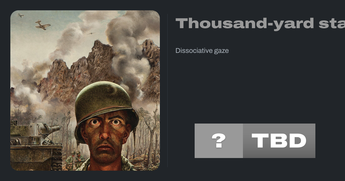 The thousand-yard stare (also referred to as two-thousand-yard stare) is the blank, unfocused gaze of people experiencing dissociation due to acute stress or traumatic events. The phrase was originally used to describe war combatants and the post-traumatic stress they exhibited but is now also used to refer to an unfocused gaze observed in...